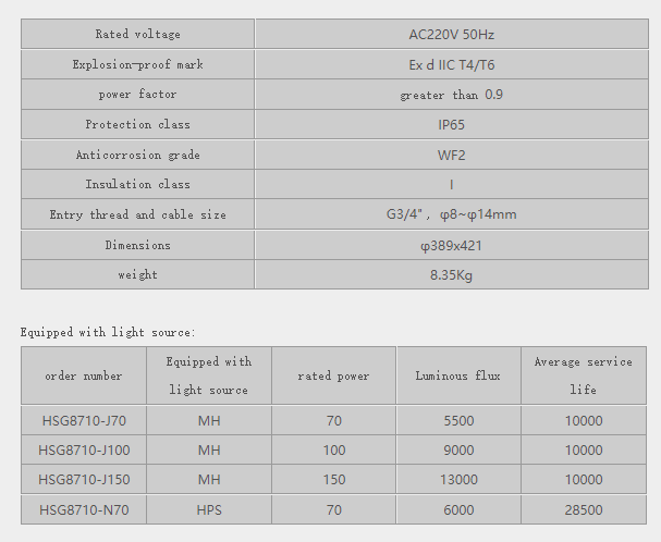 HSG8710 explosion-proof platform light is suitable for fixed lighting in flammable and explosive places such as petroleum, petrochemical, and ships, as well as various installation areas, pipeline areas, workshops, transfer stations, and joint stations. 2. Performance characteristics Explosion-proof high-explosion-proof grade, can work safely and reliably in flammable and explosive dangerous places. High-intensity gas discharge lamp is used as light source, with high light efficiency and long service life. Using advanced optics and lighting principles to optimize the design of transparent parts, the light is soft, the illumination is uniform, and there is no glare, which effectively reduces the visual fatigue of the staff. It adopts integrated full-tight structure design and new surface treatment technology, which does not change color, does not rust, is waterproof and rain-proof, and can be used for a long time in harsh environments such as high temperature, humidity and various corrosive conditions. The shell is made of high-strength aluminum alloy material, and the protection level of the shell is as high as IP65 , which has the ability to resist strong collision and impact. Beautiful appearance, simple and convenient installation and operation. 3. Technical parameters