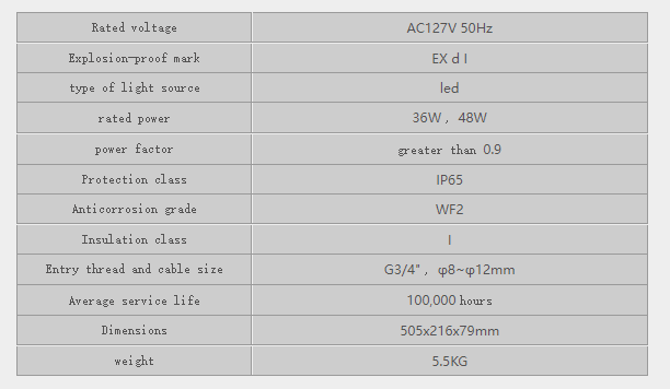 1. Scope of application The company has developed DGS36(48)/127L(A) mine flameproof LED roadway lights according to market needs, which are widely used for fixed lighting in flammable and explosive places in coal mines. 2. Performance characteristics Explosion-proof type with high explosion-proof grade, can work safely in flammable and explosive places in the coal mine industry. Using green environmental protection LED as the light source, the light efficiency is high, and the lifespan can reach 100,000 hours. The lamp body is made of light alloy material with high strength, strong corrosion resistance and good impact resistance. Using a special light distribution design, when suspended 3 meters high, the light distribution distance can reach 15 meters. The transparent parts are made of high temperature resistant special tempered glass, which expands the heat dissipation space, reduces the temperature rise and improves the service life of the bulb. The surface of the lamp adopts new spraying technology, which does not change color, does not rust, can be waterproof and rain, and can also be used outdoors for a long time. Small size, light weight, safe and reliable lamps, simple and convenient installation and operation. Humanized appearance design, beautiful appearance, simple maintenance.